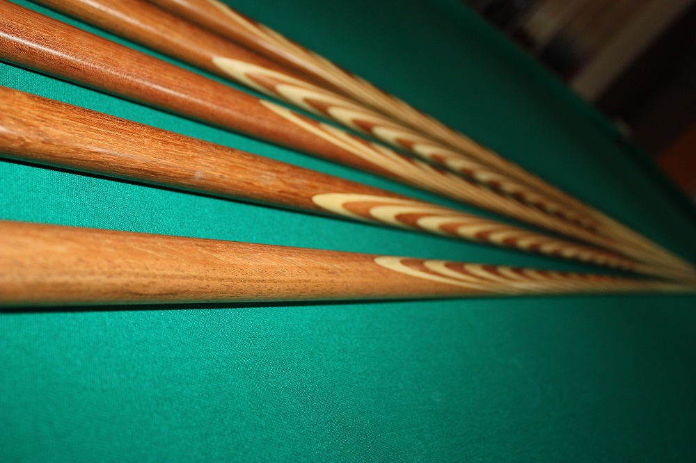 Цельные спортивные кии производства ТМ ДИНАРИС. Имеют отличные игровые характеристики и оптимальную цену. Предназначены как для клубного так и домашнего использования. Ятоба: Еще ее называют бразильская вишня. Древесина тяжелая, прочная, твердая и при этом удивительно эластичная. Она трудно обрабатывается, но шлифуется и полируется почти до зеркального блеска. Плотность 960 кг/м (куб). Твердость по Бринелю 4,8. Венге – это очень твердая и тяжелая порода. Цвет этой древисины меняется от коричневого до почти черного цвета с красивым рисунком текстуры. Стабильное, если правильно высушено и выдержано. Плотность в сухом состоянии около 880 кг/м3. Твёрдость по Бринеллю 4.3. Макассар - Ботаническое название - Diospyros celebica, растение из сем. Ebenaсеае (один из видов эбенового дерева). Существует довольно много его разновидностей. Самые популярные и давно используемые сорта растут в Африке и на Мадагаскаре. Цвет спелой древесины - от очень темно-коричневого до бархатисто-черного с характерными более светлыми (светло-коричневыми) продольными прожилками. Древесина очень плотная и тяжелая, тонет в воде. Используется в склейке и турняке бильярдных киев. Плотность: свыше 1000 кг/м(куб), твердость свыше 8,0. Граб: граб наиболее широко распространен в Европе, Малой Азии и Иране. Древесина блестящая, тяжелая, вязкая. Плотность 750 кг/м (куб). Твердость по Бринелю 3,5. Эти кии выполняются из двух пород древесины: шафт из граба, а турняк из сапели или ятобы на турняке имеются двенадцать запилов. Длина кия 158-162см.Вес кия 700 - 740 гр. Баланс кия 410 - 450 мм