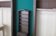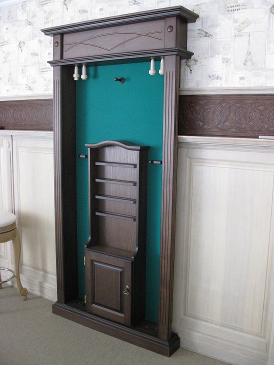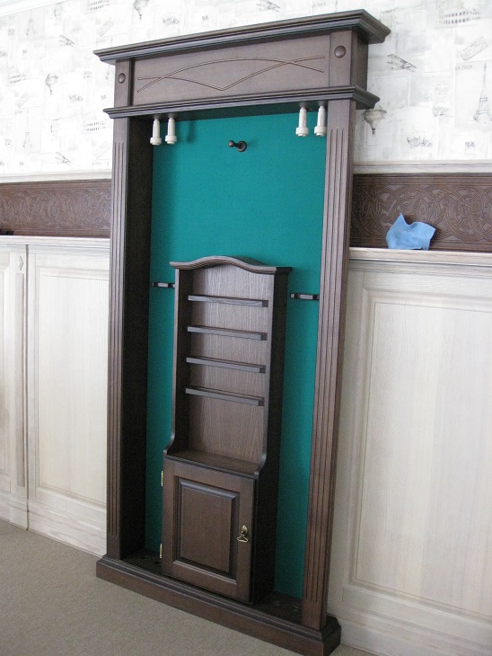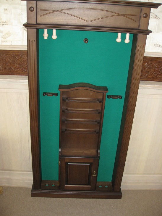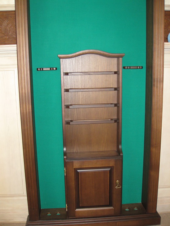 Эта напольная полка изготавливается под бильярдный стол "Динарис-Спортивный" (но так же может быть сделана в другом стиле бильярдного стола, кроме "Граф","Император", "Аквитания") - соответственно отделке и декору этого стола. Имеет место под подвес 4 киёв, ещё по 2 кия с каждой стороны стоит, опираясь пятками на нижнюю часть полки. Так же в полке есть место для треугольника и шаров, В нижней части киевницы находится небольшой шкафчик. Изготовлена из ясеня, задняя стенка полки обтянута бильярдным сукном. Высота - 2100мм, ширина - 975мм, глубина - 230мм.
