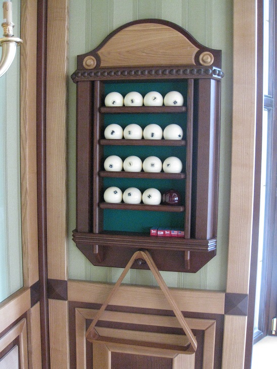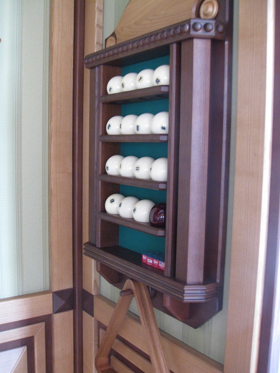 Настенная полка разработанна специально для бильярдных комнат. Включает в себя место для хранение шаров, место для подвешивания треугольника, а также полочку для хранение мела, протирочной ткани и др. Задняя стенка полки зашита сукном. Размер: высота - 750мм, длина - 420мм, глубина - 84мм. | ||