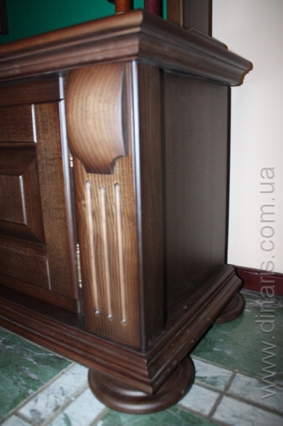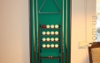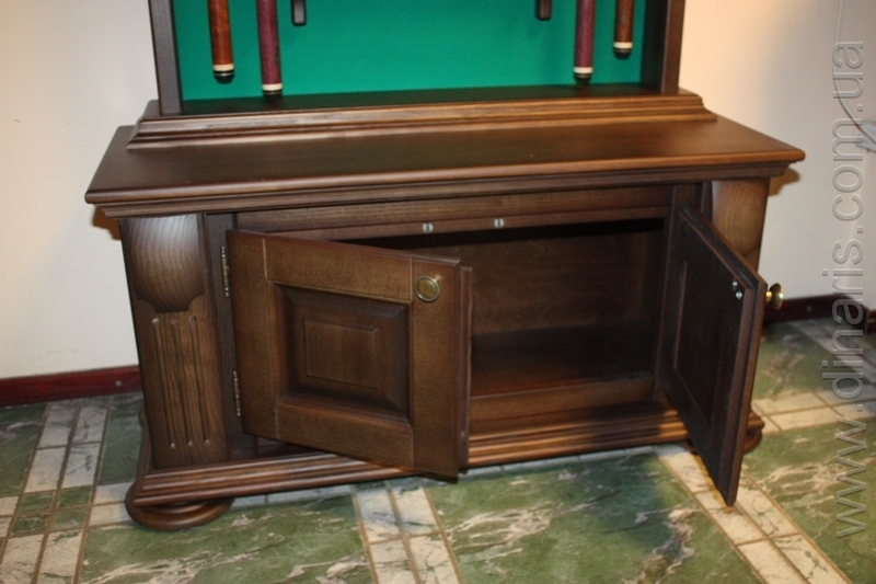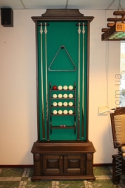 Эта напольная полка изготавливается в стиле бильярдных столов (кроме "Граф","Император","Аквитания") - соответственно отделке и декору этих столов. Имеет место под подвес 4-х киёв, треугольника и шары, а также небольшой шкафчик в нижней части. Изготовлена из ясеня, задняя стенка обтянута бильярдным сукном. Высота - 2410мм, ширина - 1040мм, глубина - 400мм. | ||
